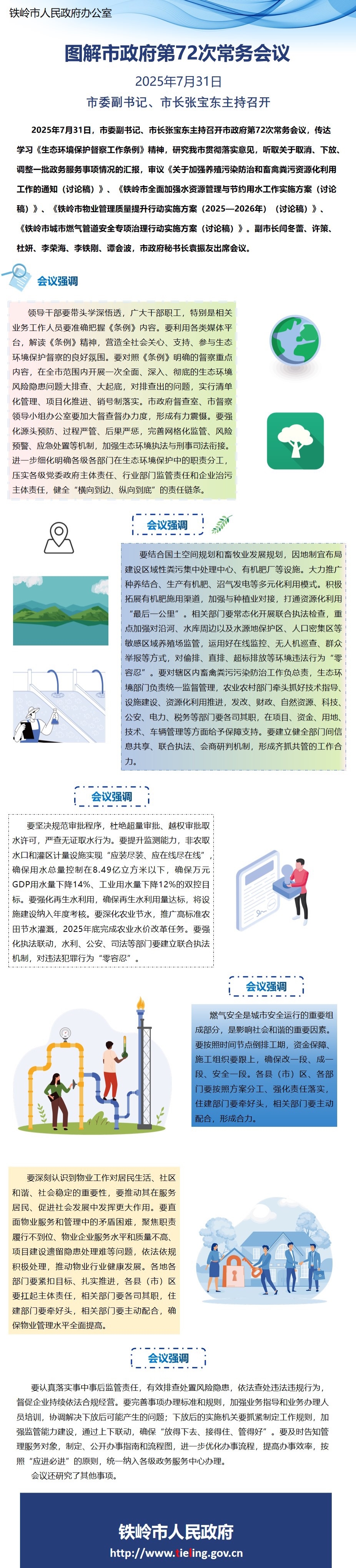 2025年7月31日,市委副书记、市长张宝东主持召开市政府第72次常务会议,传达学习《生态环境保护督察工作条例》精神,研究我市贯彻落实意见,听取关于取消、下放、调整一批政务服务事项情况的汇报,审议《关于加强养殖污染防治和畜禽粪污资源化利用工作的通知(讨论稿)》、《铁岭市全面加强水资源管理与节约用水工作实施方案(讨论稿)》、《铁岭市物业管理质量提升行动实施方案(2025—2026年)(讨论稿)》、《铁岭市城市燃气管道安全专项治理行动实施方案(讨论稿)》。副市长闫冬蕾、许策、杜妍、李荣海、李铁刚、谭会波,市政府秘书长袁振友出席会议。