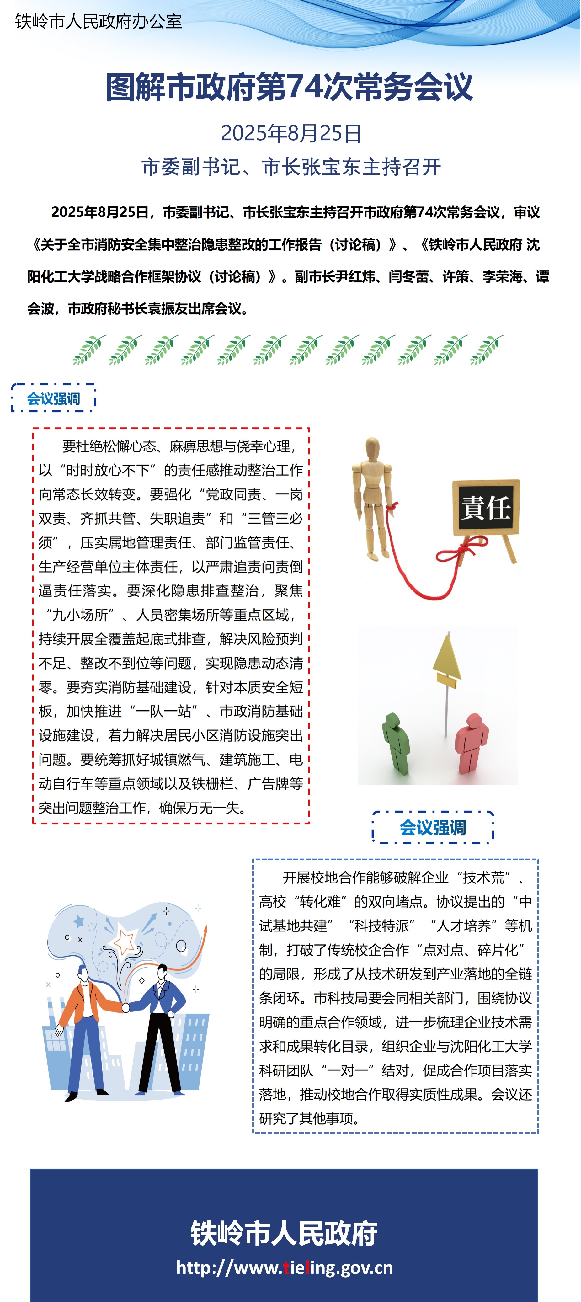 2025年8月25日,市委副书记、市长张宝东主持召开市政府第74次常务会议,审议《关于全市消防安全集中整治隐患整改的工作报告(讨论稿)》、《铁岭市人民政府沈阳化工大学战略合作框架协议(讨论稿)》。副市长尹红炜、闫冬蕾、许策、李荣海、谭会波,市政府秘书长袁振友出席会议。