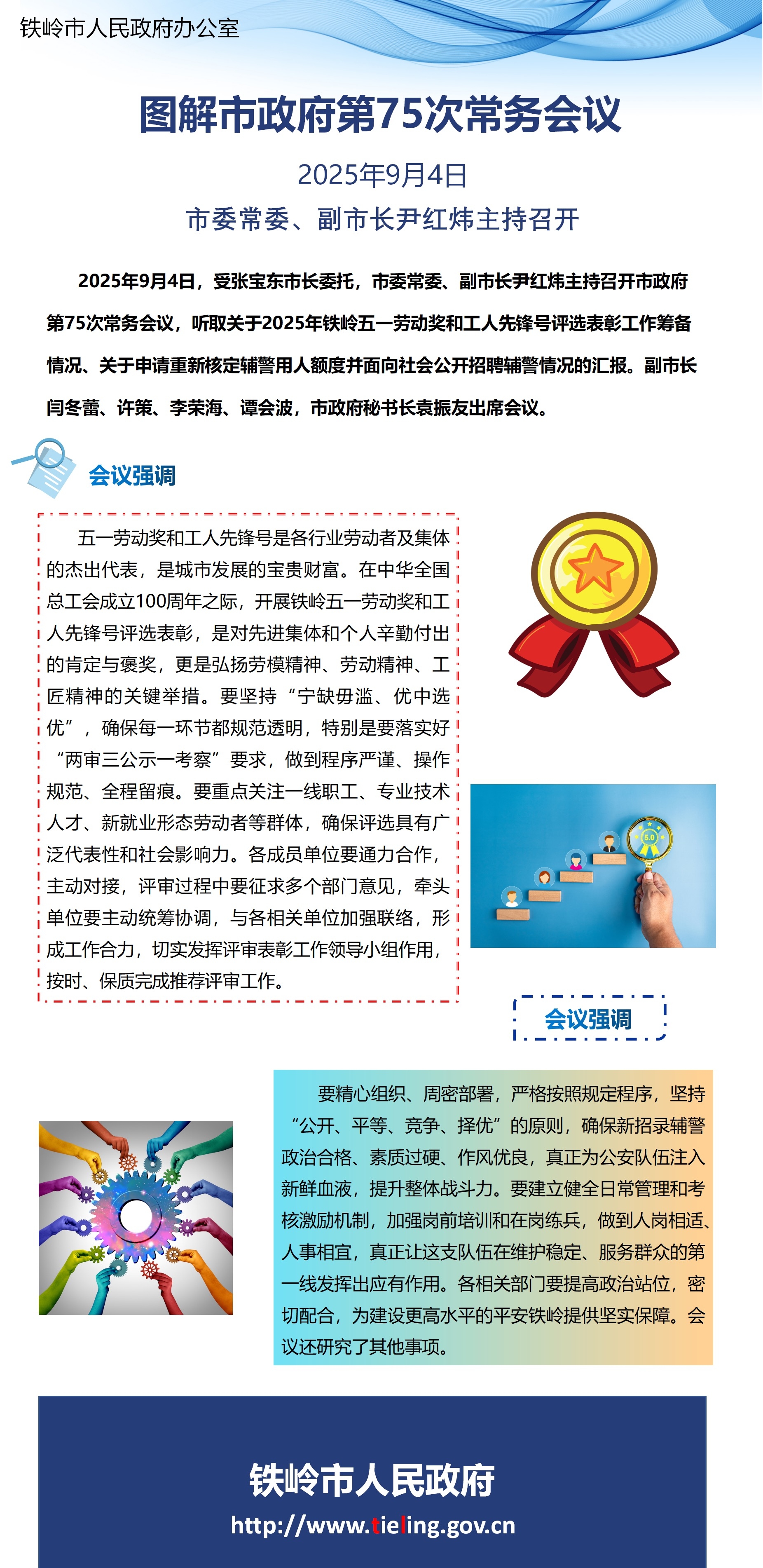 2025年9月4日,受张宝东市长委托,市委常委、副市长尹红炜主持召开市政府第75次常务会议,听取关于2025年铁岭五一劳动奖和工人先锋号评选表彰工作筹备情况、关于申请重新核定辅警用人额度并面向社会公开招聘辅警情况的汇报。副市长闫冬蕾、许策、李荣海、谭会波,市政府秘书长袁振友出席会议。