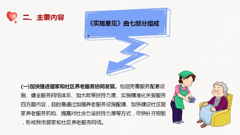 (一)加快推进居家和社区养老服务协同发展。包括完善服务配套设施、健全服务网络体系、加大政策扶持力度、实施精准化关爱服务四方面内容,目的是通过加强养老服务设施配建、加快建设社区居家养老服务机构、提高对社会力量扶持力度等方式,尽快补齐短板,形成我市居家和社区养老服务网络。