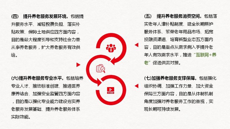 (四) 提升养老服务发展环境。包括提升服务水平、减轻税费负担、落实补贴政策、保障土地供应四方面内容,目的是最大程度引导和支持社会力量从事养老服务,扩大养老服务有效供给。