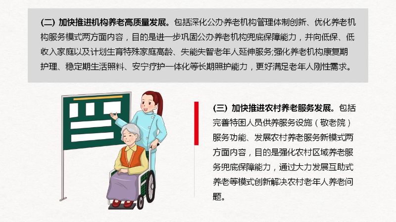 (二) 加快推进机构养老高质量发展。包括深化公办养老机构管理体制创新、优化养老机构服务模式两方面内容,目的是进一步巩固公办养老机构兜底保障能力,并向低保、低收入家庭以及计划生育特殊家庭高龄、失能失智老年人延伸服务;强化养老机构康复期护理、稳定期生活照料、安宁疗护一体化等长期照护能力,更好满足老年人刚性需求。