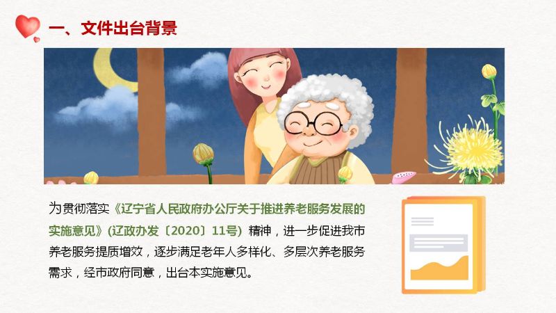 为贯彻落实《辽宁省人民政府办公厅关于推进养老服务发展的实施意见》(辽政办发〔2020〕11号)精神,进一步促进我市养老服务提质增效,逐步满足老年人多样化、多层次养老服务需求,经市政府同意,出台本实施意见。