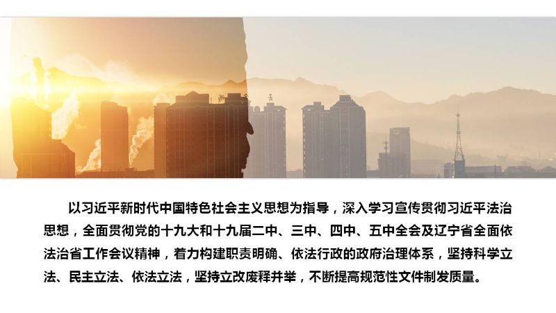 以习近平新时代中国特色社会主义思想为指导,深入学习宣传贯彻习近平法治思想,全面贯彻党的十九大和十九届二中、三中、四中、五中全会及辽宁省全面依法治省工作会议精神,着力构建职责明确、依法行政的政府治理体系,坚持科学立法、民主立法、依法立法,坚持立改废释并举,不断提高规范性文件制发质量。