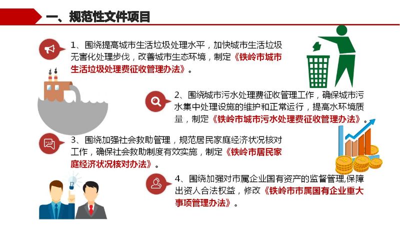 1.围绕提高城市生活垃圾处理水平,加快城市生活垃圾无害化处理步伐,改善城市生态环境,制定《铁岭市城市生活垃圾处理费征收管理办法》。