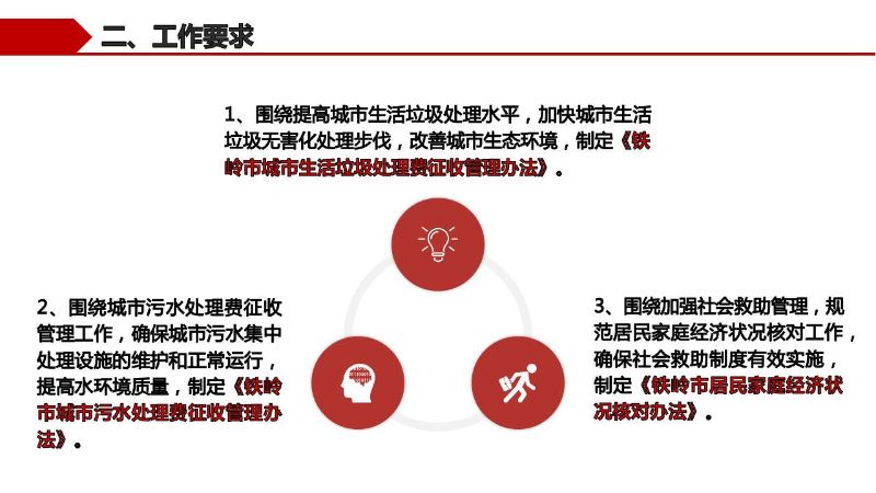 1、围绕提高城市生活垃圾处理水平,加快城市生活垃圾无害化处理步伐,改善城市生态环境,制定《铁岭市城市生活垃圾处理费征收管理办法》。