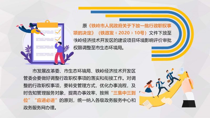 市发展改革委、市生态环境局、铁岭经济技术开发区管委会要做好调整行政职权事项的落实和衔接工作。对调整的行政职权事项,要转变管理方式,优化办事流程,及时告知管理服务对象,提高办事效率,按照“三集中三到位”“应进必进”的原则,统一纳入各级政务服务中心和政务服务网办理。