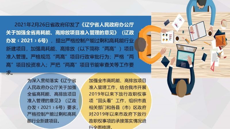 2021年2月26日省政府印发了《辽宁省人民政府办公厅关于加强全省高耗能、高排放项目准入管理的意见》(辽政办发﹝2021﹞6号),提出严格控制产能过剩和高耗能行业新建项目,加强高耗能、高排放(以下简称“两高”)项目准入管理。严格规范“两高”项目行政审批行为;严格“两高”项目投资准入;严把“两高”项目节能审查关等工作要求。